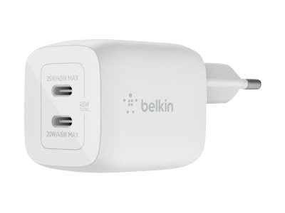 Belkin BoostCharge Pro GaN - Strömadapter - PPS- och GaN-teknik - 45 Watt - Fast Charge, PD 3.0 - 2 utdatakontakter (2 x USB-C) - vit