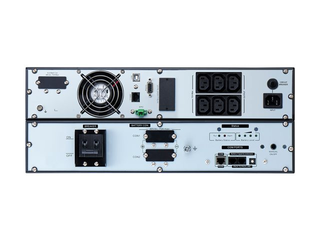 EgenskaperKan konverteras till rack/tower, LCD-status och konntrollkonsol, kvicksilverfri, fri från giftiga tungmetaller, intern förbikoppling, Eco-Mode, intelligent batterihantering, LED-indikatorer, LCD-bildskärm, automatiskt självtest, Hörbart larm, dubbel konvertering